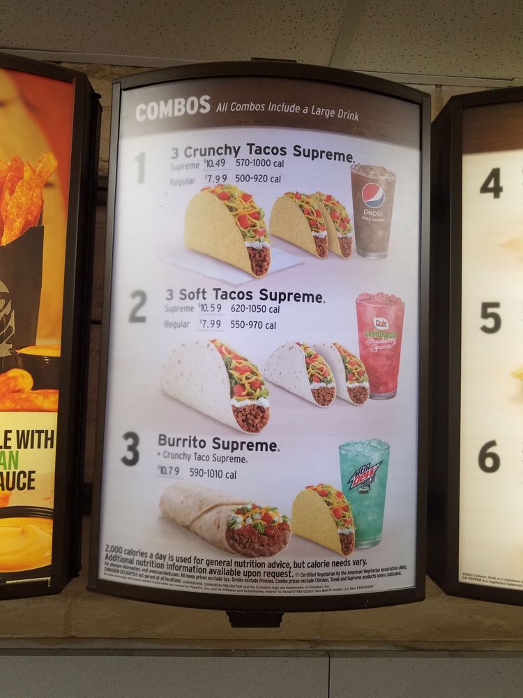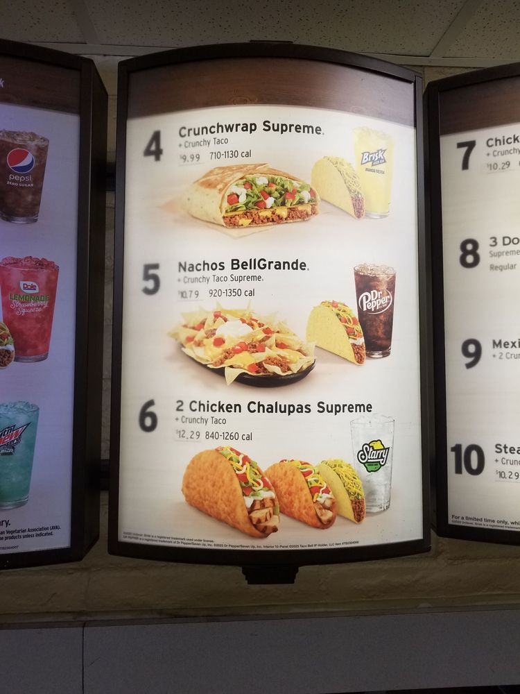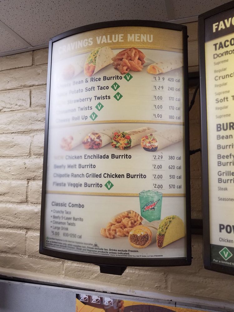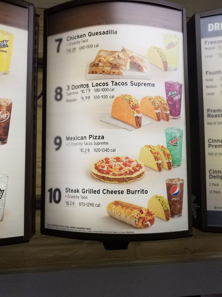 Includes a set of two Toasted Cheddar Street Chalupas, Nacho Cheese Doritos Locos Taco, a Crunchy Taco, Cinnamon Twists and a medium fountain drink.